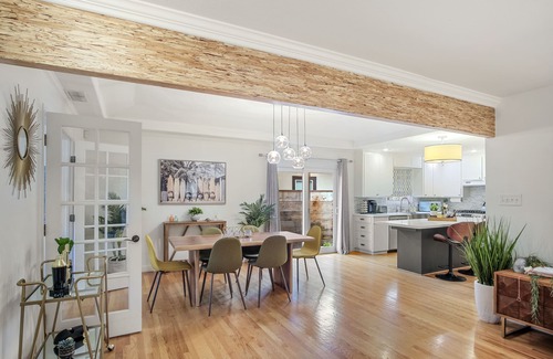 Recline in a lounge chair on the poolside patio surrounded by lush greenery. In the evening put on a vinyl record and gather for vintage cocktails in a splendid living room boasting vibrant mid-century furnishings, modern artworks, and chic touches.