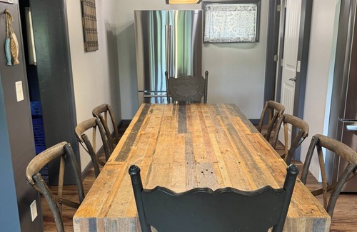 INDOOR LIVING: Dining table for 8, high-top table for 4, TVs in all bedrooms and living room, exposed wood beams, entire wall of windows to enjoy the view, adjustable Bowflex dumbbells, yoga mat, exercise mat, phone charging station.