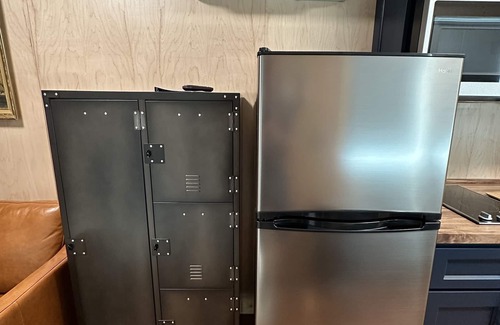 Inside, you’ll find a chic, contemporary space with maple walls, a barn metal ceiling, hardwood floors, designer cabinets, and a 50-inch flat-screen TV with Spectrum service. Stay connected with high-speed WiFi and relax in complete comfort with full climate control, city water, and a spacious bathroom featuring a walk-in shower, toilet, vanity, and washer/dryer. Outside, unwind by the stainless steel fire pit or soak in the hot tub while marveling at the stunning scenery.