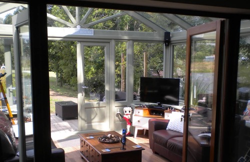 Spacious kitchen/ living room and wonderful summer room overlooking the lake.