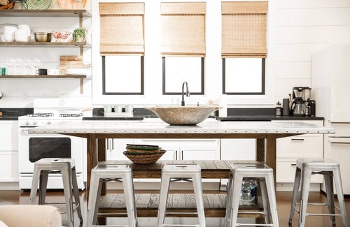 This cozy yet spacious cottage comfortably sleeps up to three families and is best described as a modern “dogtrot.” The main section of the home includes: