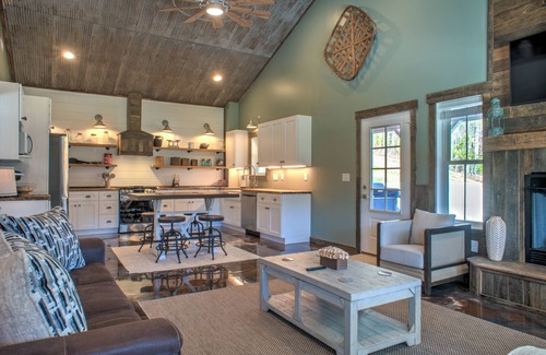 As you step inside, you'll be greeted by the contemporary allure of concrete floors that add a touch of sophistication to the farmhouse ambiance. The living area features a cozy fireplace, creating a warm and inviting atmosphere for those cooler evenings. Unwind on plush furnishings while enjoying the latest shows on the smart TV, or take in the picturesque pond view through windows that bring the outside beauty indoors.