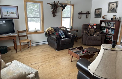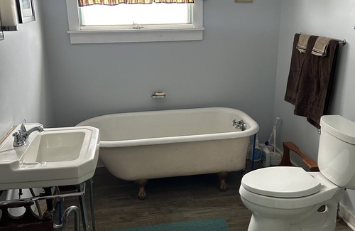 The Douglas Place is an old farmhouse, now used as a cabin, situated on 55+ acres of prime hunting ground--adjacent to 3000+ acres of Pennsylvania State Forest Land. The house has 2 bedrooms with full-size beds, living room with a sleeper sofa, loft area with 3 twin beds, 1 bathroom with shower and claw foot tub, towels and linens provided, fully-furnished kitchen, microwave, modern oven, and fridge. Cook your meals on the stove or on the campfire!