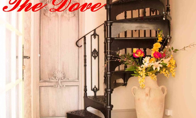 The Dove is our 80m² two bedroom vacation rental house. You enter into a double height hall with the living room/kitchen/dining through a door on your left, bathroom on your right and a glorious spiral staircase going up to the two bedrooms that are under the eaves.