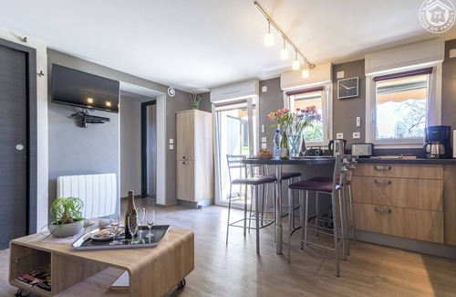 Gîte on the ground floor of the owners' house. Level access. Living room-kitchen-lounge area, flat screen TV + DVD player. Integrated and equipped kitchen. Shower room (large shower, thermostatic fittings, electric towel rail). Independent WC. 2 bedrooms (1 double bed 140 x 200 cm, memory foam mattress, flat screen TV / 1 double bed 140 x 200 cm, memory foam mattress). Free WIFI. Sheets included + beds made. Linens provided. Private terrace with electric removable awning, private garden. Barbecue. Garden Lounge. Access to the owners' pool (according to timetables). Private parking within the grounds of the property. Weekend on request at certain times. Contemporary villa in a quiet residential area near Lac du Bourget (2.5km). Ideally located near Aix-les-Bains. Immediate environment of quality. Easy access to the lake. Very good comfort. Qualitative furniture and appliances giving a warm contemporary character to the cottage. Pleasant private exterior.