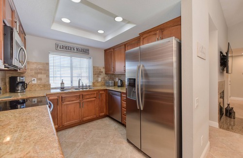 - Contemporary gourmet kitchen, fully stocked and set-up with brand new high end stainless steel appliances, granite counter tops, custom travertine tile backsplash.