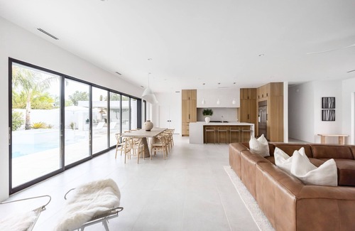 Enter The Dreyfus from the courtyard into a spacious open floor plan featuring lofty ceilings, artful lighting, and a striking 30-foot glass wall—safely secured to meet pool safety standards while offering stunning views.. Boutique designer furniture and artwork enhance the home throughout. Each bedroom has direct access to the outdoors. The primary and junior primary bathrooms are each complemented by private adjoining indoor/outdoor showers. The chef’s kitchen is a culinary haven featuring luxury appliances, including a commercial range, double oven, and coffee bar.