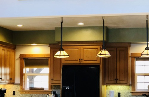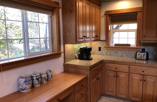 -Chef's Kitchen with gas stove. This includes tons of pots and pans, blender, waffle makers, crock pots and more. There are also dishwasher tabs, dish liquid, trash bags and paper towels.