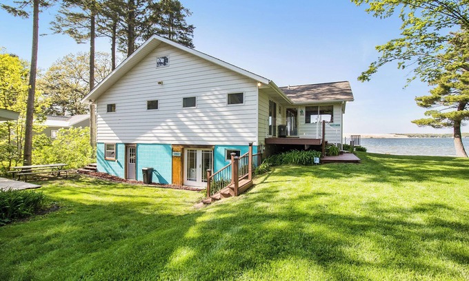 Duneview Resort features 3 houses and sleeps 38 comfortably! It has 100 feet of private beach. This listing is to book the entire resort for an amazing family vacation. This vacation rental has hundreds of 5 star reviews from their previous owners, and we are excited to keep providing that same experience. It features a private beach, game room, pool table,and amazing views of the Silver Lake dunes! Bring your own boat, or rent our pontoon!