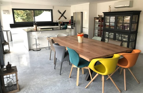 It includes a large living room of 65m2 incorporating a large open kitchen fully equipped with central island (bar), a dining room for 12 guests, a large living room furnished with two sofas, ottomans, cushions, coffee table and TV 65 "and an internet connection (WIFI).