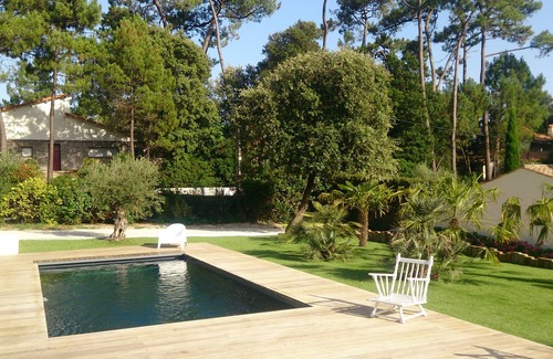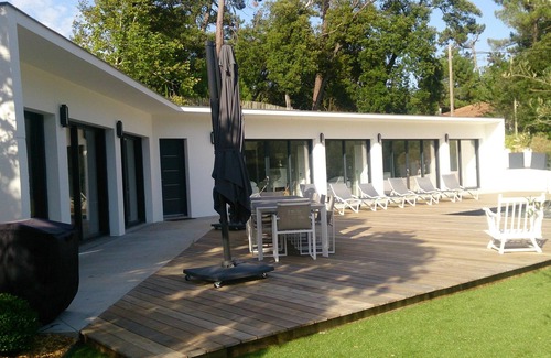 Its landscape integration in the natural dune of the land will seduce you. It is a modern comfort house, air-conditioned, facing south of a surface of 160m2. The 7 bay windows overlook a spacious exotic wood deck that surrounds the 8mx4m heated pool secured by a submerged electric shutter.