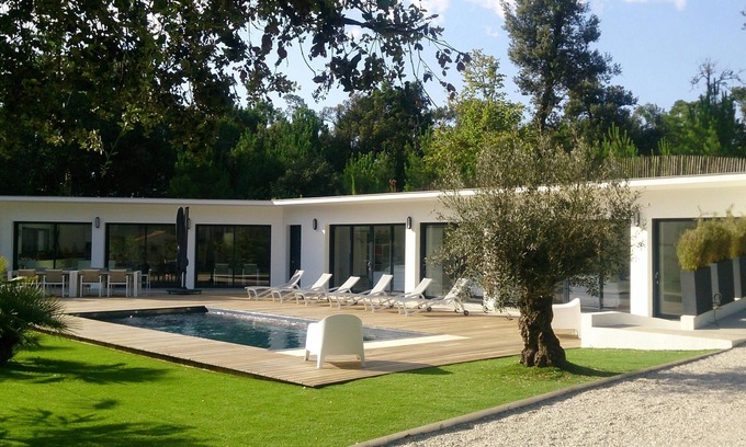 Enjoy the Villa Dune for its privileged location, close to the sea (Platin beach) and its landscaped environment on a garden of 1600m2 planted with green oaks, olive trees, boxwood, oleanders and hydrangeas