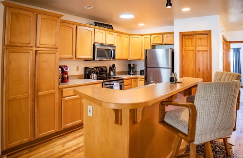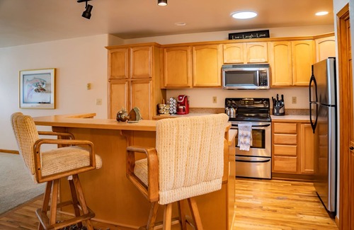 The fully equipped kitchen features island seating and a dining area that seats six. Other amenities include a washer and dryer, two flat-screen TVs with cable, and Wi-Fi (login info posted inside).
