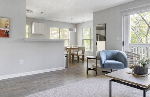 Discover The Durham II, a 2-bedroom, 2-bathroom walk-up on the second floor in Durham, NC. This pet-friendly unit includes a kitchen, Wi-Fi, air conditioning, and access to a gym and pool, making it perfect for up to four guests.