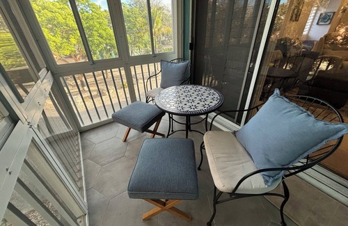 This corner unit will give you a bit more elbow room. Located on the second floor with a private closed-in balcony overlooking the pool. Unit is newly furnished. Master has a queen bed and Smart TV. Guest bedroom has a double bed and a twin bed also with Smart TV. Living room has a 55' TV with a oversized sofa and recliner.