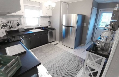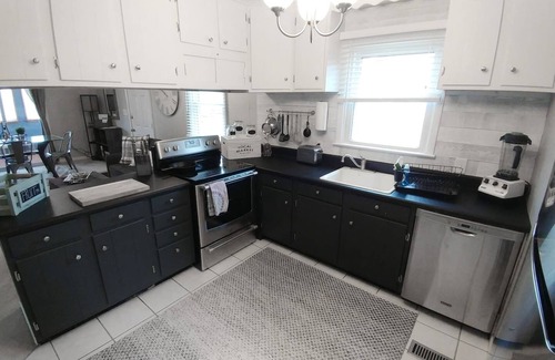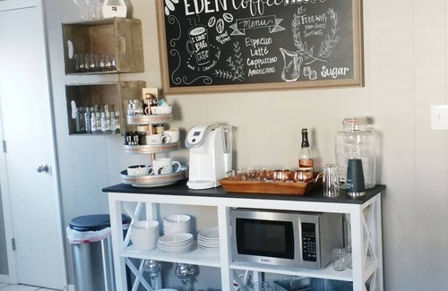 -The Kitchen is fully equipped with stainless steel appliances (oven/stove, dishwasher, and refrigerator), retro microwave, pots and pans, a variety of cooking utensils, dishes, silverware, glasses, wine glasses, cookie sheets, baking dishes, a toaster, a ninja blender, Tupperware, a knife set and cutting boards, and A COFFEE BAR with a Keurig Coffee Maker!