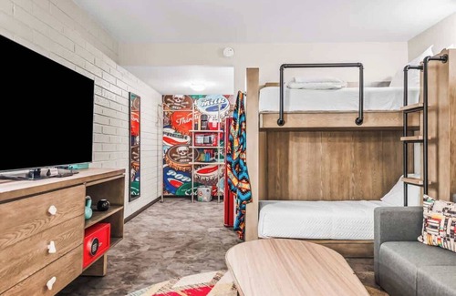 Welcome to our COMBO Retro Bunk Bed Room and King Bed Room, located right next to one another. The Retro bunk Beds Room comes with double-sized murphy bed and bunk beds, where retro design meets comfort for a fun-filled stay! The King Bed Room comes with a king bed and pull out couch. The unit is perfect for families, friends, or anyone young at heart, this vibrant room captures the essence of cool retro vibes while providing all the amenities you need.