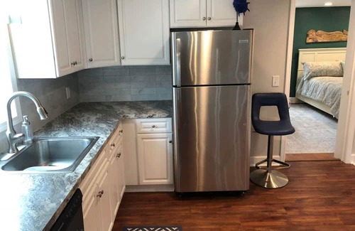 This BEAUTIFUL 3-bedroom, 2 bathroom open concept house offers peace and privacy along with the convenience of being just steps from the water!The Ehmann House is one of our larger propertes, and is perfect for those guests that enjoy the nicer things in life. Larger groups are no problem in this open living area, with hardwood floors, beautiful comfy couches, chic electric fireplace and 55” flat screen smart TV. If you need more space to spread out, wander through to the second sitting area furnished with plush chairs, where you can watch the boats on the water out of the large picture windows. A round glass top table with soft cushioned chairs is nearby for meals, hot cup of coffee or a game of cards. The Ehmann kitchen is perfect for whipping up dinner for a crowd or crew, as it is fully stocked right down to the spices. There is a large custom built-in bar with 8 bar stools. Stainless-steel appliances accompany the beautiful cabinets. White subway tiles, custom designed counter tops and breathtaking artwork make this kitchen one you’ll remember. When you’re ready to snooze, this home has sleeping for eight between the three bedrooms and couches. The Ehmann master bedroom is a large grey and teal colored spacious spa-like room furnished with a queen-size bed, dresser and beautiful relaxing chairs. This master bedroom has the convenience of en-suite bathroom with a double granite vanity, and a tiled walk-in shower. The second bedroom, with two high post twin-size beds is serene with breathtaking artwork and a large overstuffed chair. This makes it the perfect place to curl up and relax with a book. The third bedroom at the Ehmann is a fabulous green and white room with two twin-size beds. Seating, plush bedding and beautiful artwork finish this bedroom to make it a restful place to lay your head. Two large, full bathrooms with showers, separate laundry room with a full-size washer and dryer, chest freezer for your catch of the day, and plenty of off street parking are just some of the added benefits you will find at this vacation haven. In the evenings, enjoy this home’s private deck and yard and watch the sun set .You can enjoy an outdoor meal on the charcoal grill or gather in chairs around the fire pit. So many comforts you may never want to leave. We can't wait to host your stay!