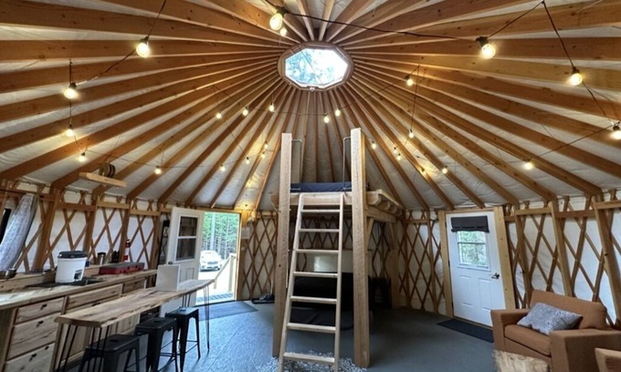 Inside the yurt you will find a kitchenette complete with a draining sink, Stanleyinsulated water jug, propane camp cook stove, enameled dinnerware set, Stanley cookware and coffee French press, silverware, and serving utensils. It is fully furnished with a bar table, 6 barstools, couch, 2 arm chairs, coffee table, and a timber frame loft area! The loft area has a lower queen bed and an upper queen bed. *Note* bedding is not provided. Up to two dogs are welcomed with a pet fee of $20/night per dog.Doggy bags are provided for pet clean up and are located at the front door. Ample hooks are placed throughout the yurt for hanging jackets and drying wet gloves and hats near the fire. The yurt is equipped with a small solar system that powers the 12v LED lights and 4 USB outlets for charging phones, laptops, and iPads. *Note* guests should bring any adapters needed to plug into USB ports. A guest binder inside offers instructions for the solar power, stoves, a site map, and Bethel area dining and activities guides. Solo stoves are provided for outdoor fires year round. Along the stone seating around outside, guests will find 4 adirondack chairs under strings of lights along with stacks of firewood and cast iron fireplace tools. Baskets of fire starter and kindling and lighters or matches are located inside. All provided at no additional fee!