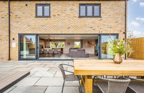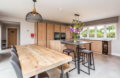 The exterior of the barn is traditional in design, complimenting the Lincolnshire landscape. The large contemporary and comfortable open-plan interior is warm and welcoming with an attractive, quality finish with style and comfort throughout. The kitchen is very well-stocked and has everything you need from the drinks cooler to the washing machine and tumble dryer, ideal for self-catering accommodation. Gather your family and friends around the large dining table to enjoy some food before sinking into the 8 seater sofa and cosying up in front of the roaring log burner. Throughout your stay, logs are provided in addition to underfloor heating to keep you warm during your stay.