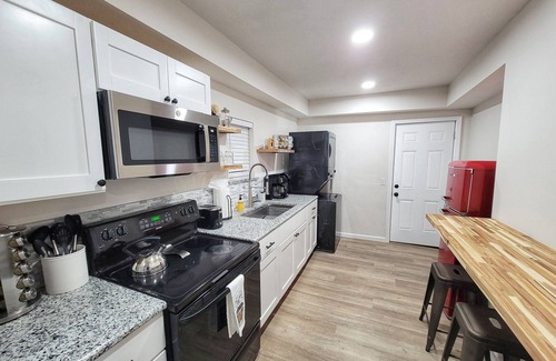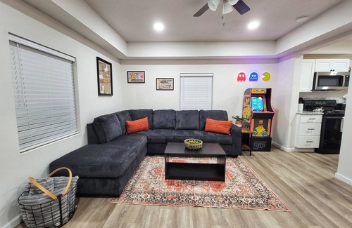 After an exciting game day, or a night out on Main Street Norman, come back and relax in the hot tub. Whether you enjoy some nostalgic arcade fun, or streaming your favorite show, we have you covered! If you don't feel like cooking in our fully stocked kitchen, there are plenty of restaurant options a short walk away. Wind down on our comfy couch and binge some shows on the 50" Roku TV with high-speed internet (300Mbps).