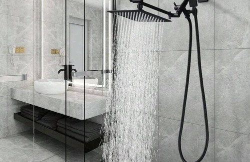 You can enter the hallway to find a handy closet near the stairs, perfect for stashing your gear. Beyond it lies a bathroom that's pure indulgence: a chic floating vanity, a smart bidet toilet, and a spa-like walk-in shower with a rain showerhead cascading from above, plus a handheld option for ultimate comfort. Luxurious towels, plush bathrobes, and a hairdryer elevate the experience—you might never want to leave!