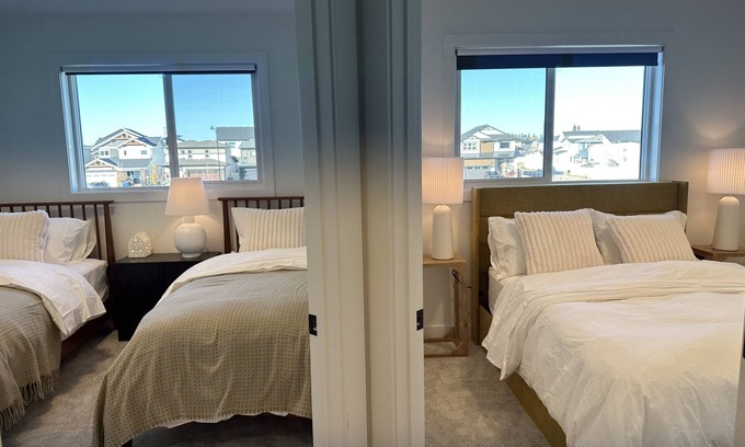 Beautiful, brand new, 2 story (plus developed basement) home. 4 bedrooms, 4 bathrooms, queen sofa bed. (Can sleep up to 10). Organic duvets, cotton bedding, all new Logan and Cove mattresses (except sofa bed), black out blinds in bedrooms, tulip table, article dining chairs. 75” tv in basement as well as a PS5 with two controllers. 55” tv in main bedroom. Luxury towels from Hudson Bay. Record player that can be hooked up to blue tooth. Organic shampoo/conditioner/body wash. Close to River Bend golf course and Canyon ski hill. Cute community with playground and walking trail around ponds. 3 min drive from Starbucks, grocery store, gas station, gym, restaurants, spa/salon. 10 minutes from downtown Red Deer.