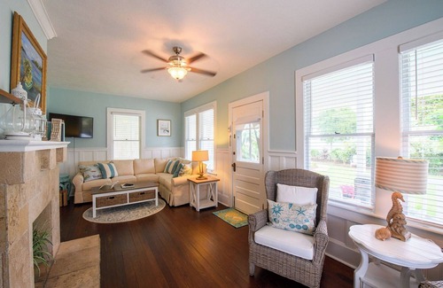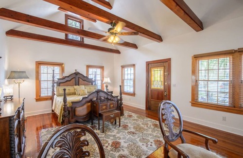 Building #3: The third building in the compound is The Enchanted Cottage which is a two-story 1,600 square foot 2 BR 2 BA cottage featuring antique Florida heart-pine flooring and paneling, two bedrooms (king bed in spacious second-floor master bedroom and full bed in smaller ground-floor bedroom), a fully-equipped kitchen, a dining room with dining table for 8, a spacious living room with fireplace and cozy furnishings (including a queen sleeper sofa), two bathrooms with shower (one on each floor), in-kitchen washer and dryer, a private wrap-around porch with outdoor seating and views of the courtyard and pool, and access to the pool and spa with comfortable outdoor furniture.