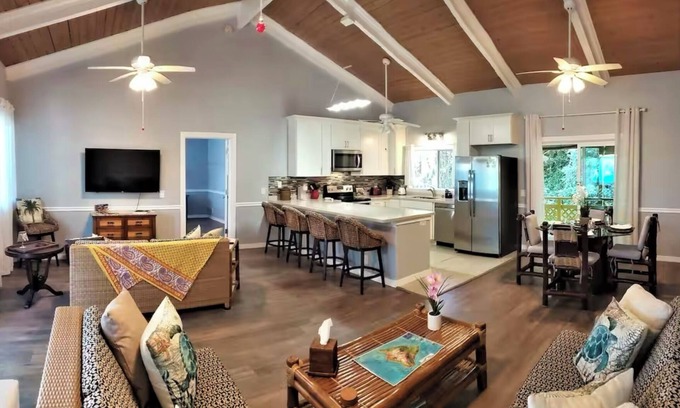 Welcome to The Famous Peacock House, a vibrant and whimsical Hawaiian getaway designed for families and friends to create unforgettable memories together. With space for large groups, thoughtful amenities, and a prime location on the lush side of the Big Island, this home is perfect for relaxation, adventure, and fun.