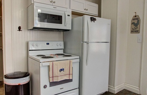 The Farmhouse has 3 bedrooms, and two bathrooms. There is also a fully equipped kitchen with a stove/oven, refrigerator, microwave and coffee maker. There is a living room, dining room, and game room. The front porch has rockers to relax and there is an outdoor hot tub.