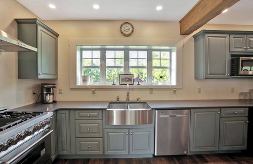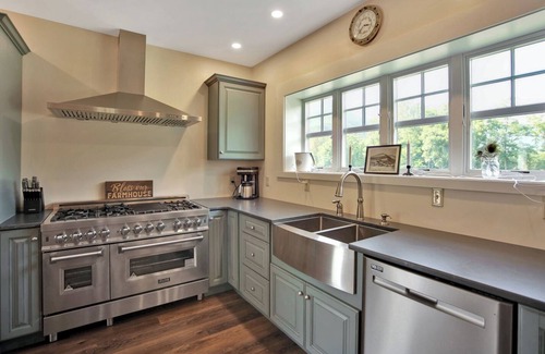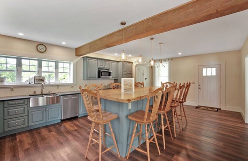 Inside, the farmhouse exudes warmth and simplicity. Built in 1901, the exposed wooden beams stretch across the ceilings, and hardwood floors creak gently underfoot. The kitchen, often the heart of the home, features a long and beautiful island for guests to gather and enjoy a meal at the end of the day. The expansive counter tops and large farmhouse sink make mealtime a breeze.
