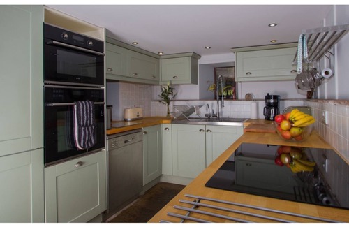 There’s a large fully equipped kitchen with induction hob, built in oven and combi-microwave, dishwasher and Belfast sink with trigger spray arm. We have stocked the kitchen for all you’ll need to feed a crowd, including baking supplies, slow cooker, Actifry and Nespresso machine. There’s cosy bench seating and a small cafe table.