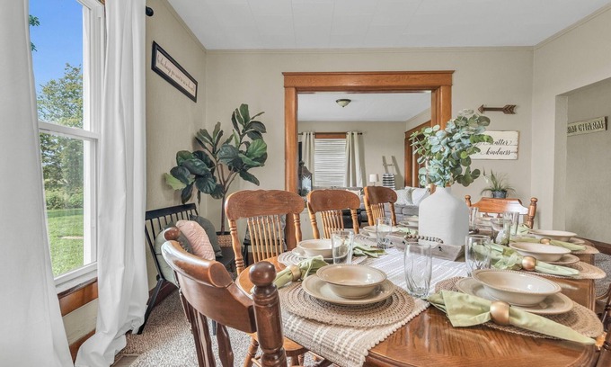 Welcome to The Farmhouse offers beautiful country views and plenty of space!, the ideal wedding accommodation nestled in the enchanting countryside of De Kalb, Missouri. This charming historic farmhouse exudes rustic elegance while providing ample room for you and your guests to create unforgettable memories. With its peaceful surroundings, the property allows you to escape the hustle and bustle, making it the perfect backdrop for an intimate wedding celebration.
