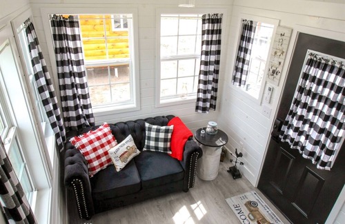 If you love the cozy and charming look of a farmhouse, you will adore this tiny house. It has a white and black exterior that matches the interior design. This tiny house is a gem if you like board and batten exterior siding with black trim and an interior with a farmhouse feel. This house has custom features galore. Everything from the custom-made galvanized metal barn door leading to the bathroom to the old farm tools used for handles. So many of these custom-made features were rescued from an old local farm and repurposed for this house.