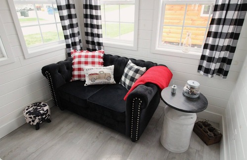 Overhead in the main living area is a custom chandelier made with old glass implements and bottles from the hundred-year-old barn. Many of the farm tools were repurposed into railings and lights. The buffalo plaid black and white curtains add a little whimsy which draws you back to a simpler time in life. Step into the bathroom area with a pump handle-like faucet on the sink. There’s a small collection of washboards, fitting décor for the bath area. The pops of red plus the chickens and roosters around the house make this a fun choice for your stay at Tiny Digs Lakeshore.