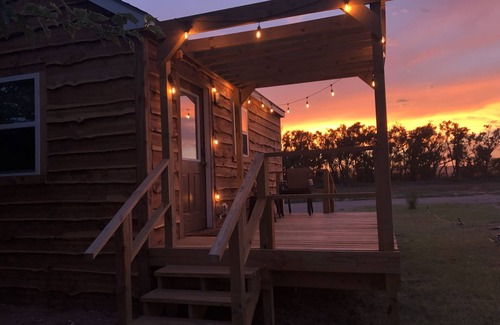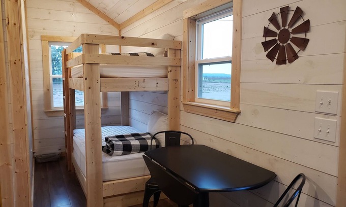 The Fern Cave, named after a hiking destination in Caprock Canyons, is a small (approximately 14’ x 18’) tiny cabin. It is a studio-style cabin, furnished with a queen-size bed and twin bunk beds. It sleeps 4 people. It has a bathroom with a shower, sink, and toilet.