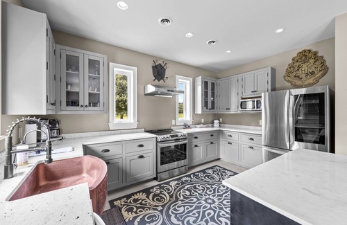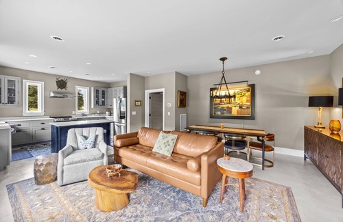 “The Fox Den” is located in the west wing of The Field House and is larger with a fabulous, open floor plan state-of-the-art kitchen, dining area, and living room that leads into a separate office, walk-in closet, bathroom, and primary suite with queen bed.
