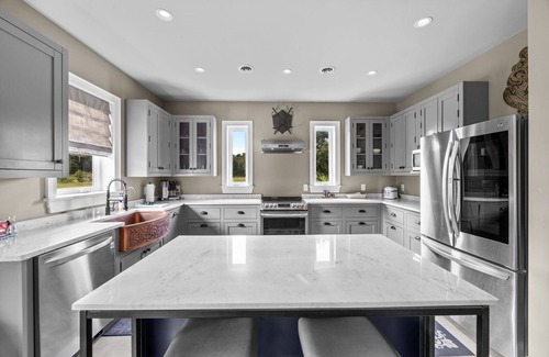 Segue from the dark exterior to the sunlit interior with a fully equipped chef’s kitchen, high-speed internet, smart TVs, local artwork, waterfall shower heads, luxurious bedding and more! This property is approximately 2600 square feet and features two wings, separated by an elegant indoor breezeway, making the house wonderful for two couples or folks who want to spend time together and also have privacy.