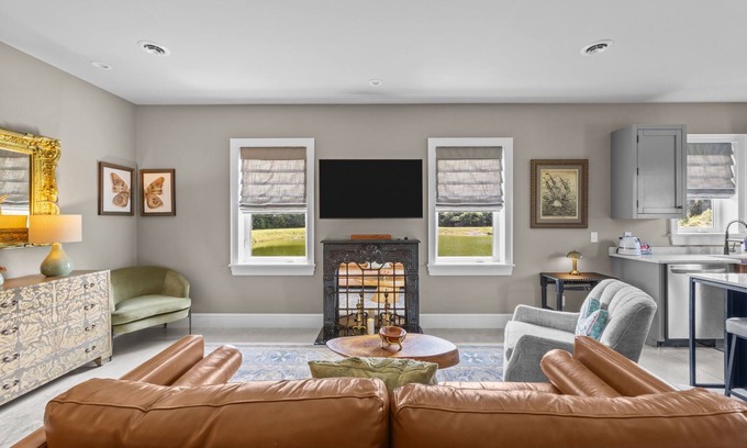 “The Beehive” is located in the east wing of The Field House, featuring a luxurious bedroom with a queen bed and ensuite bath that overlooks the pond. There isn’t a full kitchen in the beehive… but you have access to a refrigerator and a clever nook with coffee/tea brewing equipment and a microwave. As an added bonus, a new sleeper sofa has been added in the living space for additional comfort! Both areas have access to a laundry room that is accessible from the breezeway.