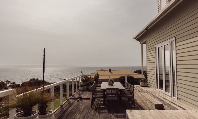 Once you step inside The Firs, the spacious living area features large windows that invite the sun in and and frame the panoramic views of the ocean. Whether you're curled up on the plush sofa with a book or enjoying a meal at the dining table, you'll have uninterrupted views of the Bass Strait.