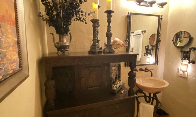 The most intimate and smallest of our two suites at Adytum Sanctuary, First Light Is most suitable for single Travelers or short stays. We have just instituted a one night minimum. For those of us who have stayed in European hotels, this will feel quite familiar and elegant Italian and Venetian art adds to the charm. First Light has a very comfortable queen bed and antique armoire. Though a petite suite, it can easily accommodate a couple. The galley kitchenette is stocked with a small refrigerator, toaster, coffee maker, microwave, and convection plate, and is suitable for light meals only.