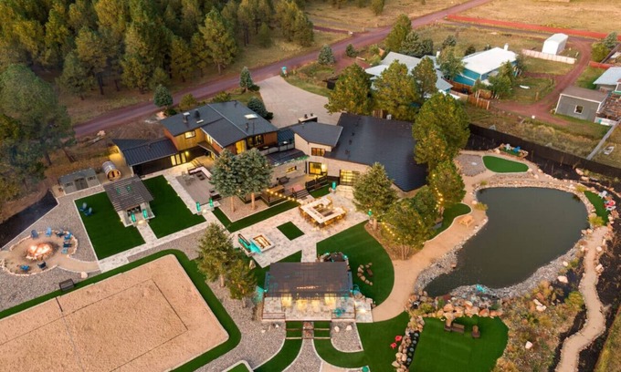 Escape to our sprawling Flagstaff retreat, a haven tailor-made for outdoor enthusiasts and adventure seekers! This expansive 8-bedroom home offers luxurious accommodations for up to 26 guests. Outdoor activities include Pickleball court, Fishing pond, Beach Volleyball, Bocci ball court, putting green, Basketball court, horse shoes, cornhole, hot tub, sauna, firepits, Massive Outdoor Kitchen. Indoor Arcade, Pool table, shuffle board, ping pong, golf simulator, Golden Tee, Movie theater.
