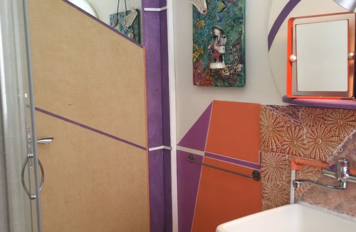 The room is located inside our art atelier. It is furnished in a simple way, but also embellished with some of our works. The room is large, equipped with a double bed and a sofa bed. It has a balcony overlooking a quiet street. THERE IS NO USE OF THE KITCHEN. However, in the corridor we have placed a table-top refrigerator and a microwave oven. For the winter periods, as heating, there are: heat pump in the room and fan heater in the bathroom. The accommodation has just been renovated. The entrance to the apartment is shared with our atelier, but the room and bathroom are private. The house is a beautiful 70's house 10 minutes walk from the beach.