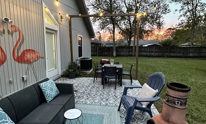 Welcome to the Flemingo where you can relax on the back patio with a glass of wine and twinkling string lights above.