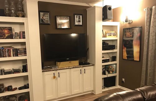 This property is a private home, offering a guest suite, with one bedroom, one bath and media room. Can use private rear entrance or the front door. We do live here, but the guest suite is private. Guests may use laundry room, and have access to kitchen for coffee, etc. Property is located directly across street from beautiful Caney Lake and within short distance of marina for easy boat access.
