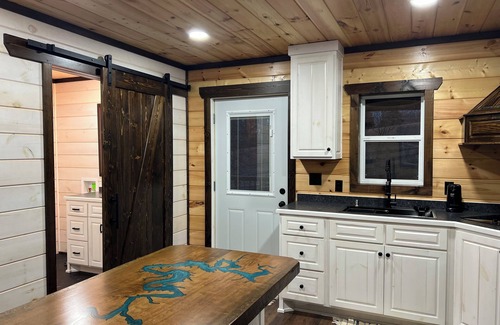 Welcome to The Flint House! We are located in picturesque Campbellsville Ky and we invite you to join us and experience what this delightful 1-bedroom cabin home has to offer. As you enter, you will be greeted into the living room featuring custom woodwork, comfortable sofa bed and a cozy fireplace for you to relax after a busy day. There is plenty of seating for everyone to gather and enjoy the peaceful setting. You can spend an evening preparing your favorite dish in this fully equipped, fully stocked kitchen complete with beautifully crafted cabinetry. After dinner, mozy on up to the loft bedroom which boasts two phenomenal queen beds for a restful night's sleep as well as a fireplace to cuddle next to for an evening relaxing. The bedroom also features a television for you to spend the evening with your favorite tv shows. Make your way to the spacious bathroom, complete with full vanity and washer/dryer combo, for a relaxing shower and don’t forget to connect to the Bluetooth speakers while you’re in there! Spend those twilight hours on either the front or back porch, enjoying the natural beauty surrounding this lovely home while listening to the creek that runs through the property this one-acre property. This cabin also includes AC, Bluetooth speakers, led lights and WiFi for added convenience. If you are planning a weekend on Green River Lake or adventuring down Ky Bourbon trail, you are welcome here. We invite you to come stay in The Flint House, where we strive to ensure that you are happy and comfortable here. We are available to answer any questions you have.