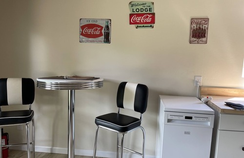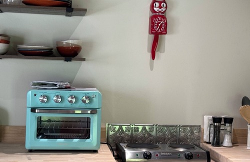 Wood Fire pit is also available and all new retro appliances with fully equipped kitchen (no oven though does have an electric stovetop) and coffee makers. Smart TV and a decorative barn door for the bathroom area. We just added an air fryer and a toaster oven!