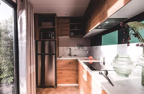Accommodation: 32m2 (4.2m x 8m6). 2 bedrooms. Terrace covered 2m50 x 6m. The must of comfort... the Riviera is ultra bright thanks to large windows on the facade and its summer kitchen as well as the open living room towards the terrace. The master suite is particularly spacious with 1 large double bed (1m60 x 2m). In the second bedroom the 2 single beds (80cm x 1m90) offer the possibility to slide one under the other to gain space, duvets and pillows provided. Very pleasant stay. convertible bench in double bed. Heating in all rooms. Fully equipped kitchen with freezer, microwave and dishwasher. Bathroom with large shower of 100x80cm! and sink. Separate toilet. Table and garden chairs. 2 sunbeds. Air conditioning