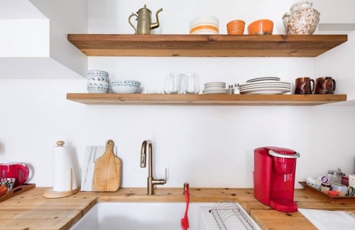 The kitchenette has all you need for quick and easy meals. Fridge/freezer, microwave, toaster oven, high end hot plate, , coffee maker, full sink and complete dishware. The studio is very spacious, and if you have a child, the futon sofa is perfect.