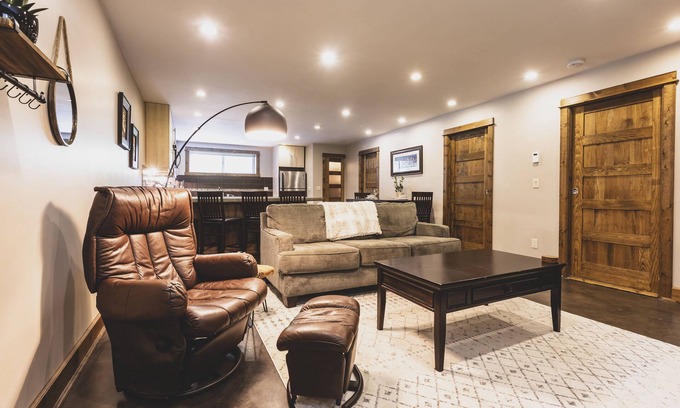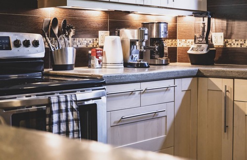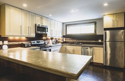 The suite features open-concept design with local wood accents & polished concrete floors and countertops. Start your morning with an espresso coffee and a stroll through the backyard forest trail. Soak in your private hot tub after a day full of activities and fire up the outdoor BBQ for dinner. The gourmet kitchen is fully stocked with everything you need to cook meals during your stay. The suite stays cool in the summertime and cozy in the winter with in-floor radiant heating throughout.
